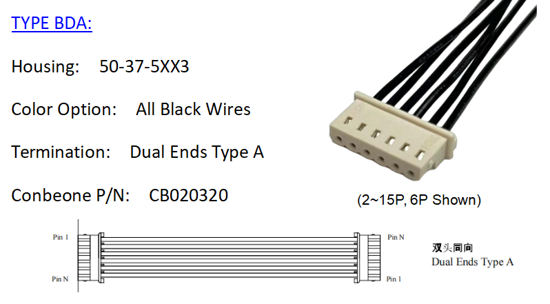 MOLEX Mini Spox 2.50mm Pitch Wire Harness,  5264 Series Housing with crimped Wires, Dual Ends Type A, All Black Wires [TYPE BDA]