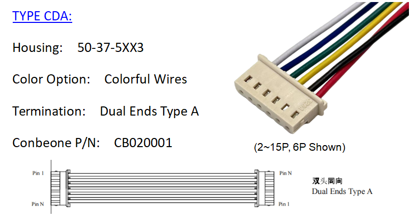 MOLEX Mini Spox 2.50mm Pitch Wire Harness,  5264 Series Housing with crimped Wires, Dual Ends Type A, Colorful Wires [TYPE CDA]