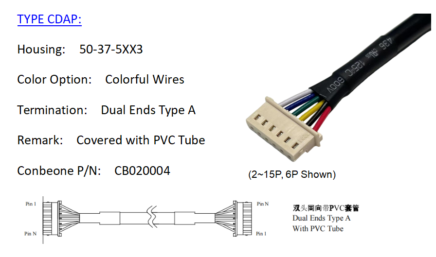 MOLEX Mini Spox 2.50mm Pitch Wire Harness,  5264 Series Housing with crimped Wires, Dual Ends Type A, Colorful Wires, With PVC Tube [TYPE CDAP]