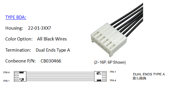 MOLEX KK 254 2.54mm Pitch Wires Harness, 2695 Series Cable, All Black Wires, Dual Ends Type A [TYPE BDA]